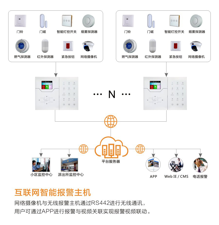 E、视频联动:网络摄像机与无线主机通讯RS422进行无线通讯,实现视频联动功能,可以实时观看视频,报警视频录像 F、全自动报警:一旦发生警情,报警主机现场警笛鸣响,并自动发送警情信息至用户手机APP,以及上传警情信息之联网接警中心。如果是使用GPRS网络的用户,还可以通过短信的方式发送警情信息至用户手机。